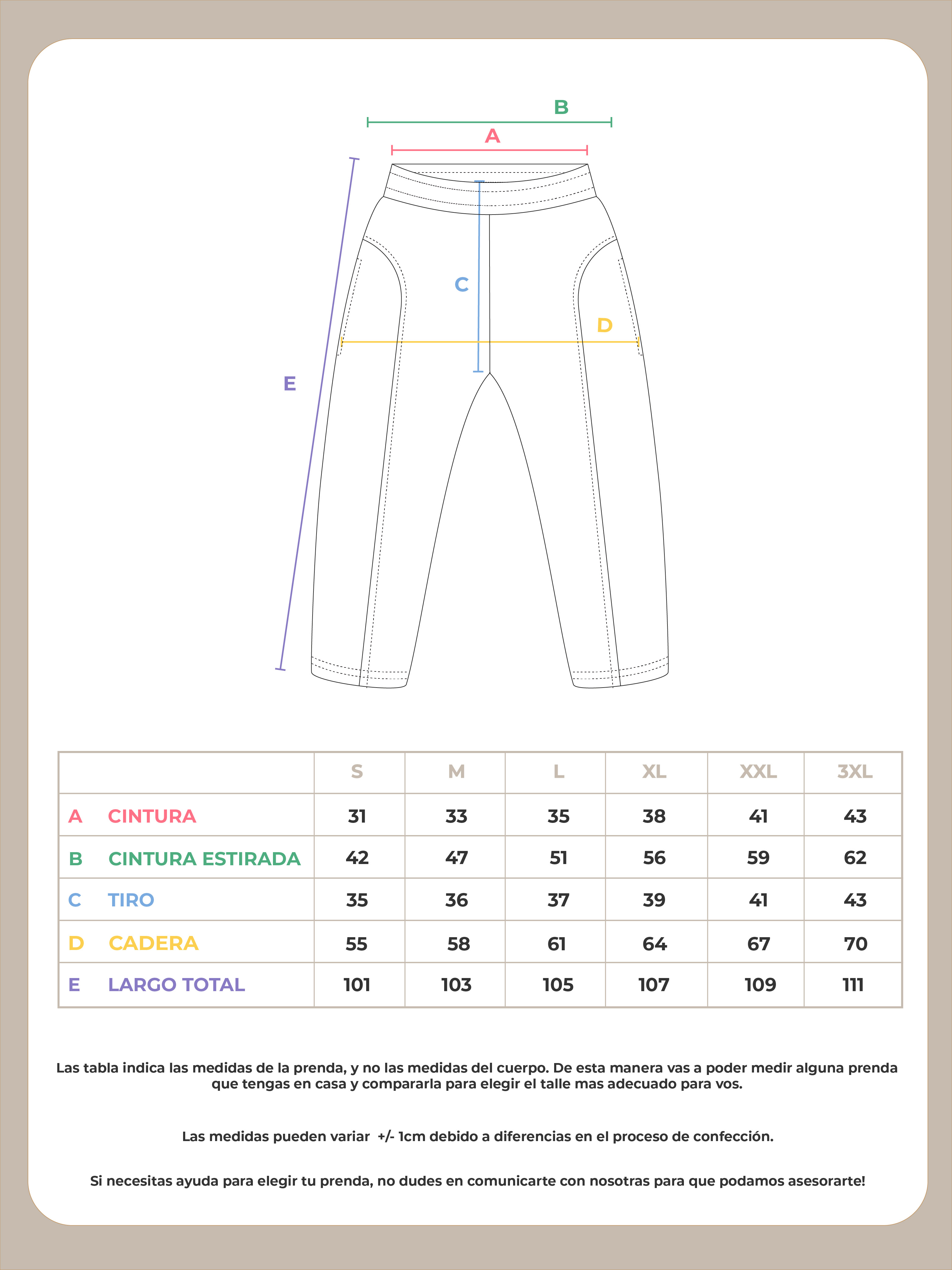 La tabla de medidas al final de las fotos del producto es una guía útil para ayudarte a elegir el talle ideal. Comparala con una prenda que tengas en casa para mayor referencia. Recordá que las medidas corresponden a la prenda, no al cuerpo.